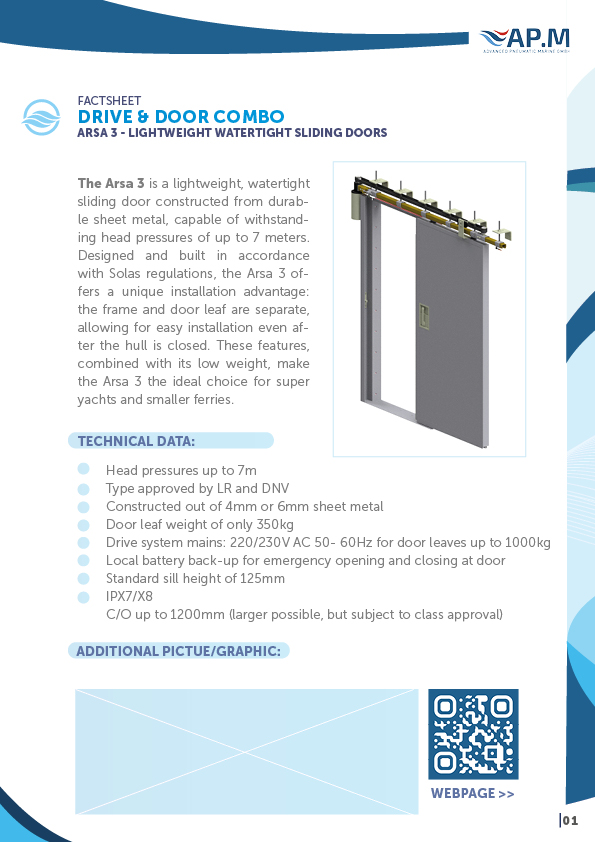 Withstands 7-meter head pressures, with separate frame and door leaf for easy installation, making it ideal for super yachts and smaller ferries.